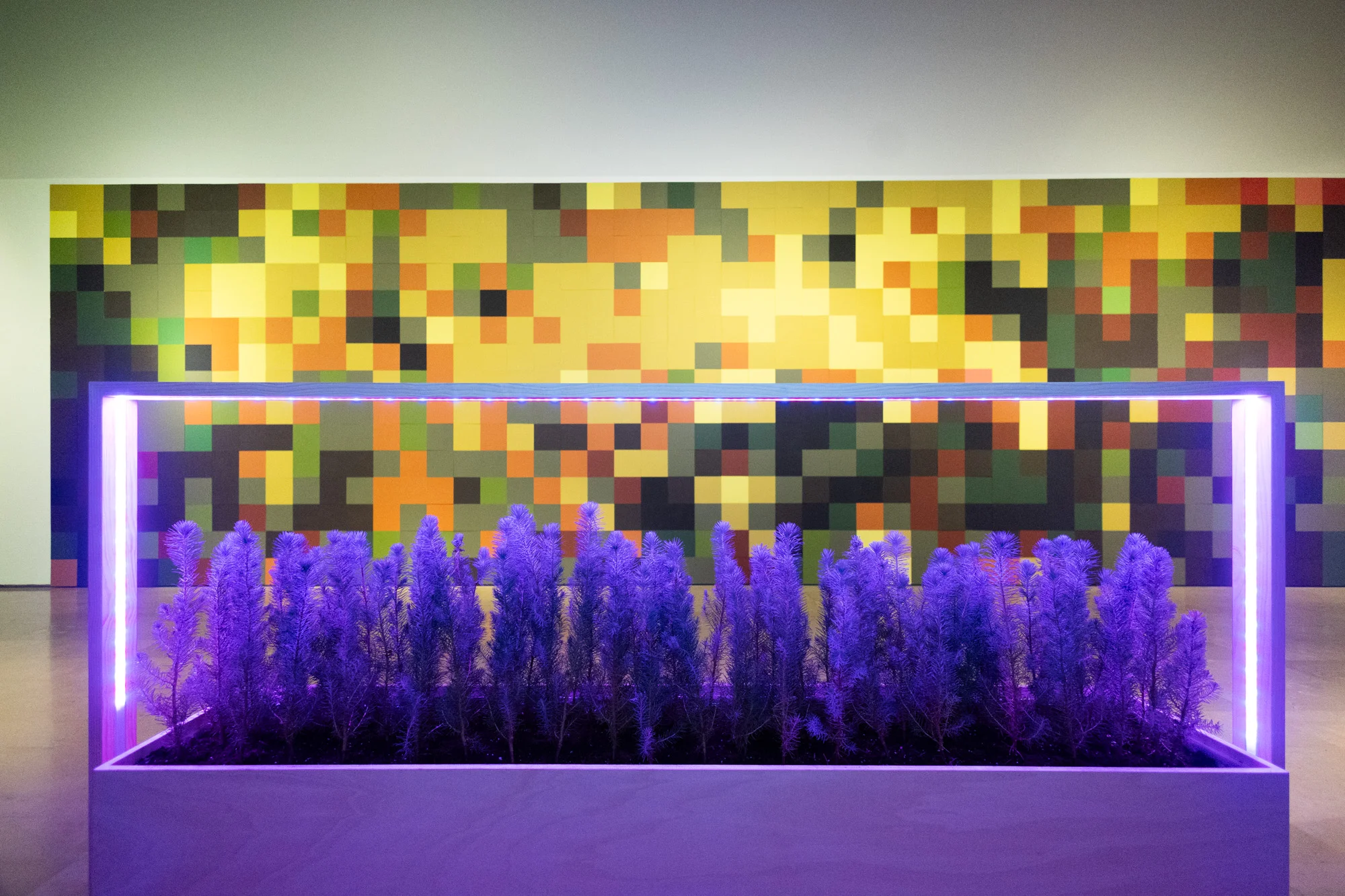 La expo­si­ción pre­sen­ta tres ins­ta­la­cio­nes que via­jan de lo digi­tal e intan­gi­ble a lo ana­ló­gi­co y real. La mues­tra par­te de la ima­gen digi­tal pixe­la­da de un bos­que utó­pi­co, que se des­com­po­ne en cua­dros mono­cro­mos de 20x20 cen­tí­me­tros pin­ta­dos a mano. Cada uno repre­sen­ta un frag­men­to úni­co de ese bos­que y sim­bo­li­za la impor­tan­cia de cada ele­men­to en el con­jun­to.