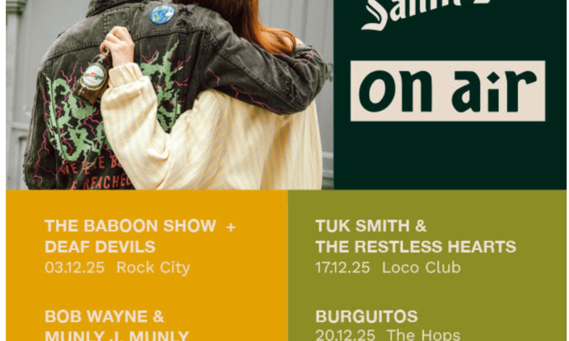 La recta final de la programación llegará con Estrella Fugaz el 13 de diciembre en Electropura y con una de las fechas más esperadas del mes: Tuk Smith & The Restless Hearts en Loco Club el 17 de diciembre. El ciclo se despedirá con Burguitos en The Hops el 20 de diciembre y el director de Farren El Guiri en El Volander el 21 de diciembre, que pondrá el broche final a esta edición de San Miguel On Air en Valencia.