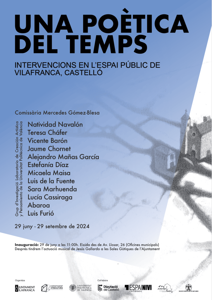 A partir del próximo 29 de junio y hasta el 30 de septiembre, la exposición “Una poètica del temps” inundará, todo el pueblo de Vilafranca (Castellón) con intervenciones en el espacio público, instalaciones, videoarte, arte interactivo, pintura, escultura, fotografía y dibujo; invitando a los/as visitantes a redescubrir su rico patrimonio cultural, a través de una nueva mirada desde el arte contemporáneo.