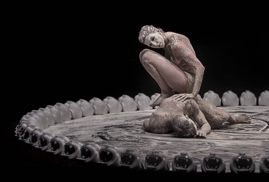 Rito es un espec­tácu­lo de media hora que se mue­ve entre la dan­za y las artes plás­ti­cas, y que por momen­tos resul­ta más pro­pio de un museo que de un recin­to escé­ni­co. Los pró­xi­mos 12 y 13 de febre­ro, el Tea­tro El Musi­cal aco­ge­rá las fun­cio­nes de esta pie­za fru­to de la cola­bo­ra­ción entre dos crea­do­res naci­das en Elche: la coreó­gra­fa Asun Noa­les, fun­da­do­ra de la com­pa­ñía Otra­Dan­za en el año 2007, y la artis­ta visual Susa­na Gue­rre­ro. Pero no lo hará sobre el enta­ri­ma­do de su sala prin­ci­pal sino en el inmen­so hall, para que el públi­co, dis­pues­to alre­de­dor del círcu­lo, pue­da obser­var la obra des­de todos los ángu­los. En su inte­rior, la pro­pia Asun Noa­les y el bai­la­rín Sebas­tián Rowinsky, cubier­tos por una arci­lla que da for­ma a sus movi­mien­tos, se fusio­na­rán en un ritual reple­to de refe­ren­cias mito­ló­gi­cas.