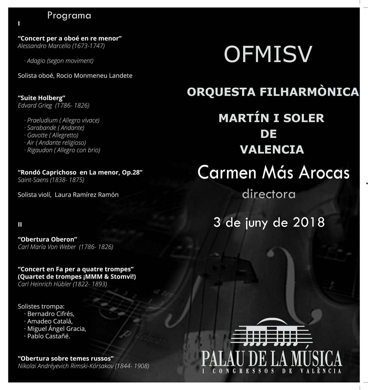 La Orquesta Filarmónica Martín i Soler de Valencia ofrecerá un concierto el próximo domingo 3 en el Palau de la Música. La OFMISV, dirigida por Carmen Más Arocas, está compuesta por más de 45 miembros de cuerda, socios de la misma, y su grupo de vientos “Amigos de la OFMiSV”. La orquesta está formada por jóvenes estudiantes de música, universitarios e intérpretes que desempeñan otras actividades profesionales, continuando así de una manera altruista el desarrollo de su vocación musical.