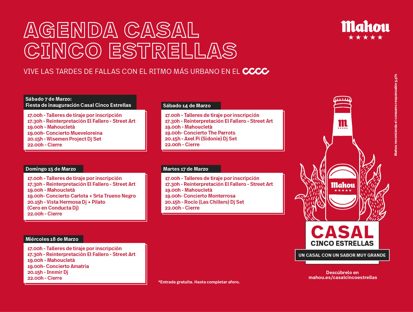 Mahou se instalará durante las próximas Fallas en el Centre del Carme (CCCC) con su Casal Cinco Estrellas, una colaboración que refleja el espíritu innovador que comparten este espacio expositivo y la marca cervecera. El resultado es una completa agenda de experiencias culturales y musicales gratuitas que se celebrarán los días 14, 15, 17 y 18 de marzo, y que contarán con una fiesta de inauguración el día 7. Una propuesta que invita a vivir las Fallas de una manera diferente y a compartir el sabor del tardeo más creativo y joven de la ciudad, desde las 17 hasta las 22 horas.