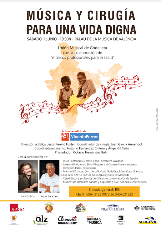 El sába­do 1, a las 19:30 horas, el Palau de la Músi­ca de Valen­cia aco­ge un con­cier­to a bene­fi­cio de la Fun­da­ción Vicen­te Ferrer, “Músi­ca y Ciru­gía para una vida dig­na”. La Unión Musi­cal de Gode­lle­ta, con la cola­bo­ra­ción de la agru­pa­ción “Músi­cos pro­fe­sio­na­les para la salud”, con­jun­ta­men­te con la direc­ción artís­ti­ca de Jesús Pere­lló Fus­ter y la par­ti­ci­pa­ción de otros pro­fe­sio­na­les de la músi­ca como Luis Cobos y Pepe Sán­chez, ofre­ce­rán un con­cier­to soli­da­rio en el que se inter­pre­ta­rán varias pie­zas con un reper­to­rio muy varia­do que con­tem­pla­rá tan­to ópe­ra, como fan­dan­go o fla­men­co.
