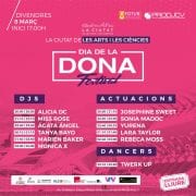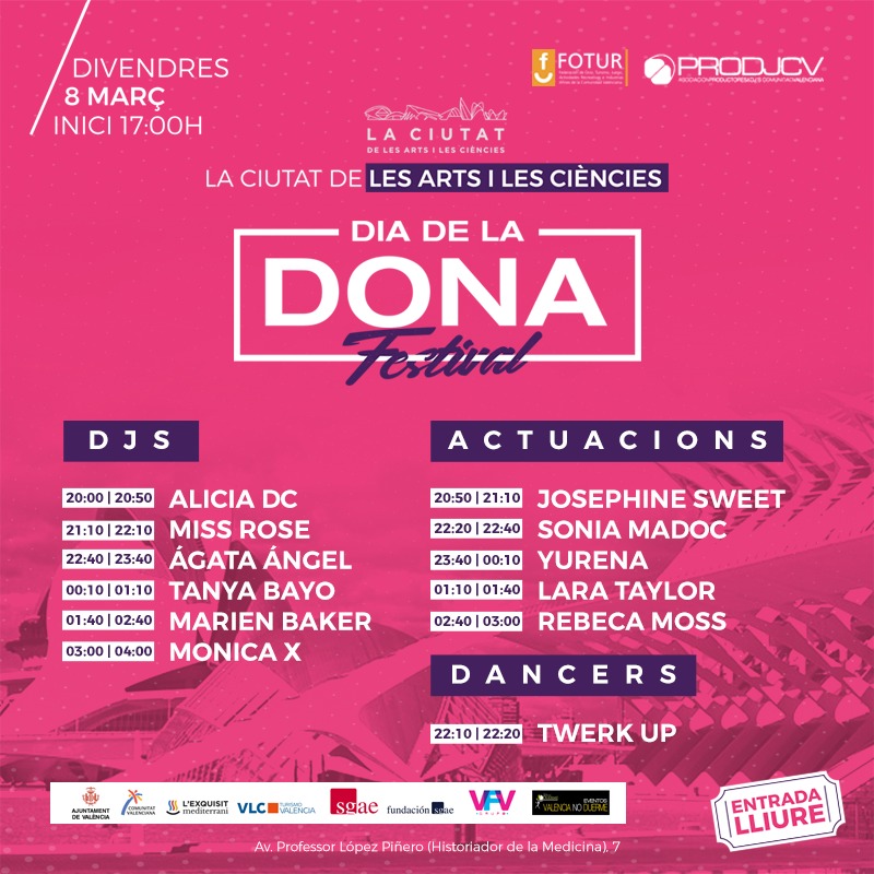 Este festival estará abierto a todos los públicos y la entrada será totalmente gratuita, con apertura de puertas a las 17:00h. La cita, con apenas dos años de existencia, ya es cita obligada en el Día de la Dona. No en vano Valencia es pionera en la celebración de este tipo de iniciativas. Para esta ocasión, la organización ha invitado a participar a dj y artistas de toda España para la gran cita en Valencia.