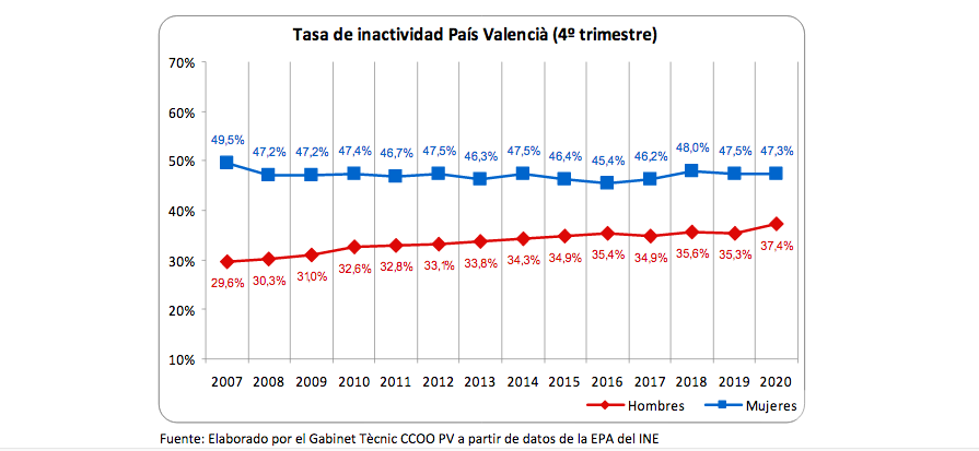 El 2020 finalizó con 398.000 personas desempleadas en nuestro territorio, con una tasa de paro femenino del 18,3% frente a la del 14,7% de los hombres. En cualquier tramo de edad, las mujeres cuentan con mayor tasa de desempleo, siendo alarmante entre las más jóvenes, con un 59,9%. Además, las mujeres se mantienen en el desempleo por más tiempo, representando el 55,6% de paro de muy larga duración (2 años o más).