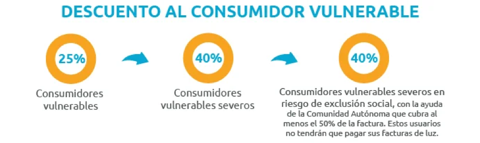 El bono social incluye dos tipos de bonificaciones, que se confieren según las categorías de consumidores correspondientes. Cabe señalar que en el caso de consumidores extremadamente vulnerables en riesgo de exclusión social, los usuarios no tienen que pagar por la electricidad en ningún caso. Esta será subsidiada al 100% por la administración pública y la propia empresa.
