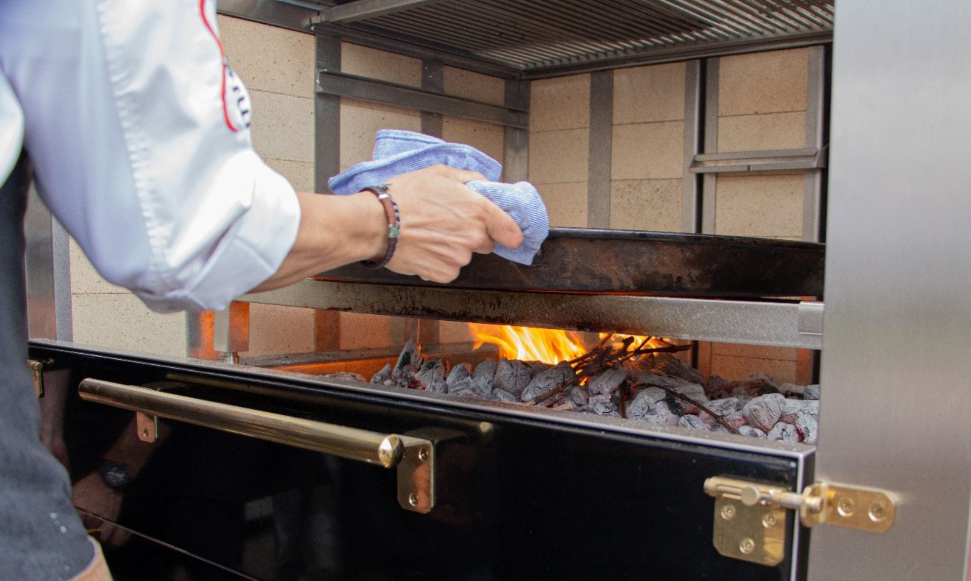 El nuevo paellero reúne en una sola estructura la cocción tradicional de paellas a leña, una parrilla vasca ajustable en altura, un asador giratorio y un asador en cruz. Puede adaptarse a paellas de hasta 95 centímetros, incorpora mandos de nivelación en cuatro puntos y un sistema de tiro inferior que permite controlar la intensidad de las brasas con precisión.