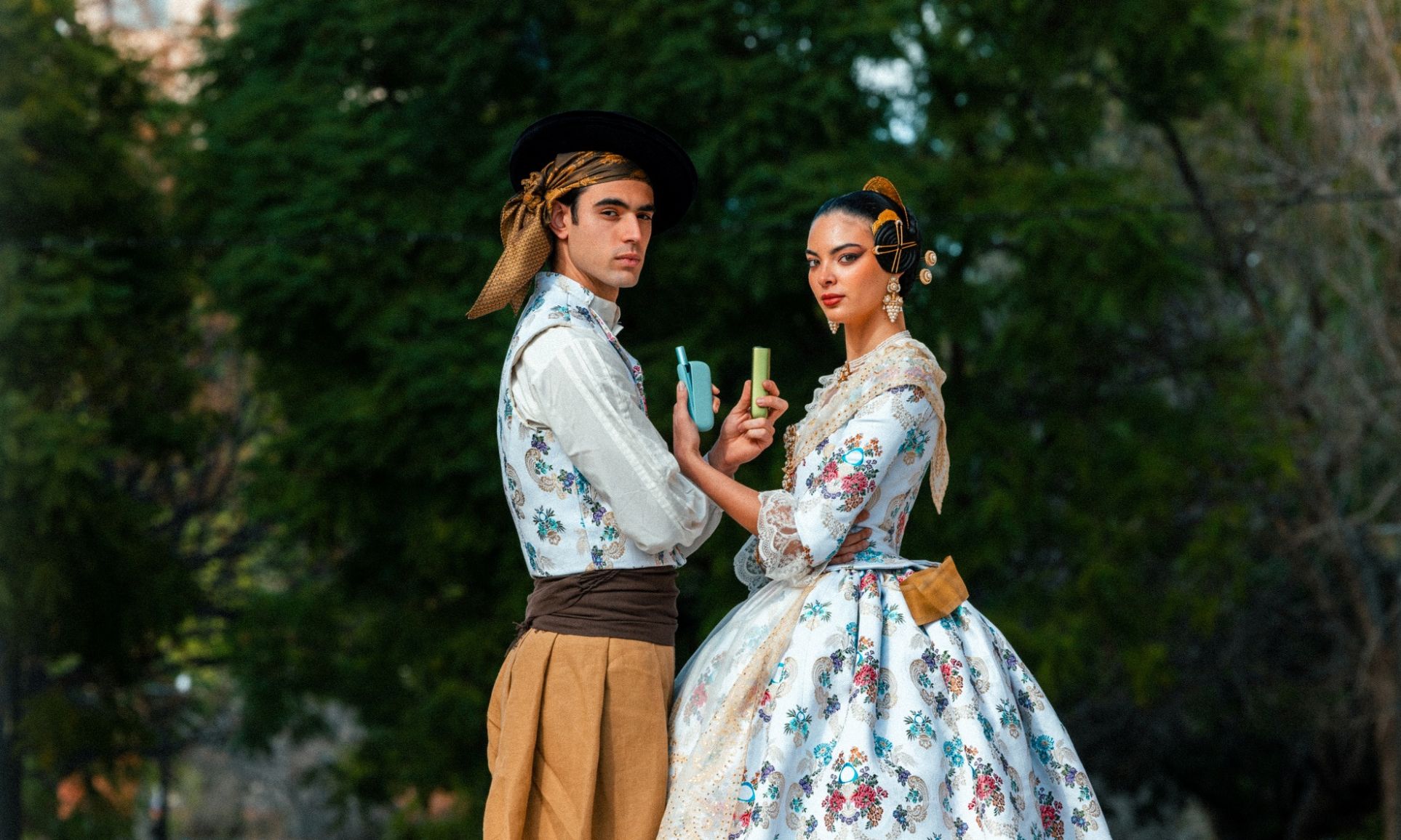 A partir de ese diseño original, se han confeccionado de manera artesanal dos trajes tradicionales ‑fallera y fallero‑, elaborados por Espolín Amparo Gómez, firma especializada en indumentaria valenciana desde 1982. El resultado respeta los códigos clásicos de la tradición, pero los reinterpreta desde una mirada actual, incorporando la key de IQOS en el pattern y elevando la indumentaria fallera a través del diseño. Así, IQOS traslada la tradición a su universo, donde diseño e innovación dialogan con la cultura local.