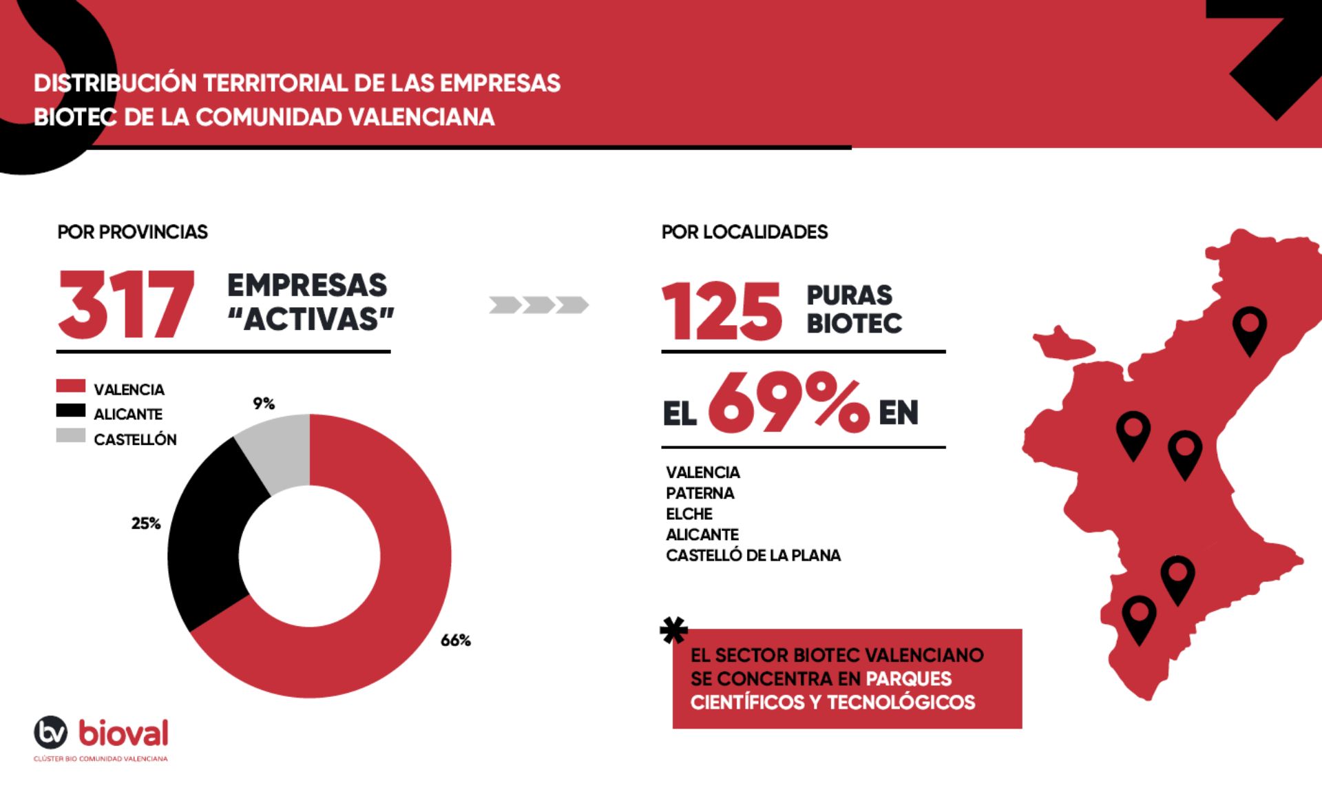 El estudio, que analiza la evolución de 317 compañías activas en la región, destaca la creación de 76 nuevas empresas en los últimos cinco años, un dato que refleja la juventud y la expansión constante del sector. De ellas, 125 son puramente biotecnológicas y 192 actividades relacionadas. València concentra el 66% de estas compañías, seguida por Alicante con el 25% y Castellón con el 9%, con un fuerte dinamismo en los parques científicos y tecnológicos de València, Paterna, Elche, Alicante y Castelló de la Plana.