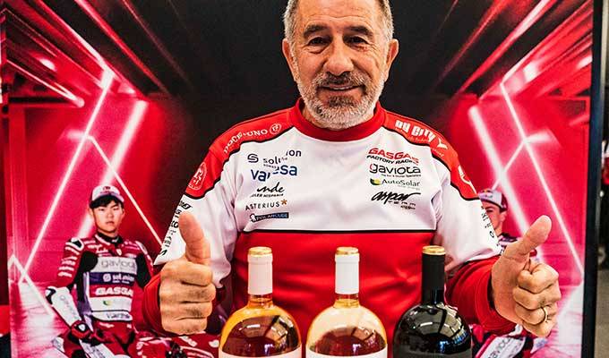 Jor­ge Mar­tí­nez “Aspar” con los vinos de Vicen­te Gan­día.
