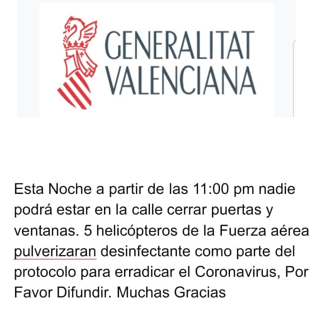 Ha comenzado a distribuirse por Whatsapp una imagen en la que se informa que esta noche, a partir de las 11 horas, cinco helicópteros de la Fuerza Aérea van a proceder a pulverizar con desinfectante la Comunitat Valenciana para combatir el coronavirus. Se trata de una información falsa, según han confirmado desde el Ministerio de Defensa.