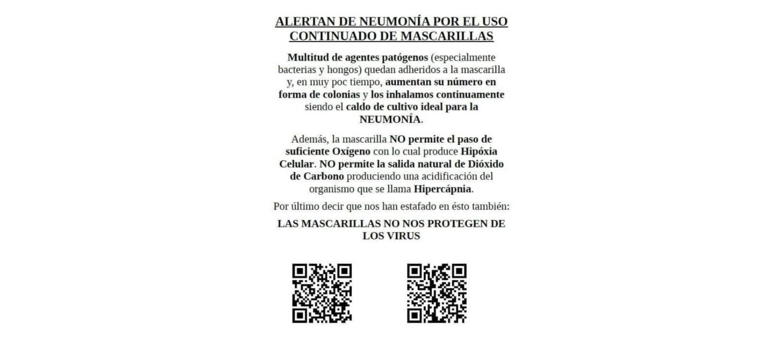 Las publicaciones por las que nos habéis preguntado incluyen dos códigos QR que llevan a dos vídeos en Youtube en los que se afirma que hay una alerta de neumonía por el uso continuado de mascarillas y que son un foco de infección bacteriana. Sin embargo, no se dan datos que sustenten esas afirmación.