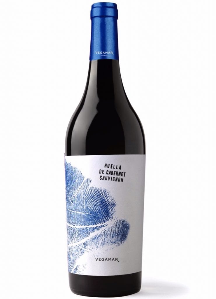 La bote­lla del Hue­lla de Caber­net Sau­vig­non de Vega­mar.