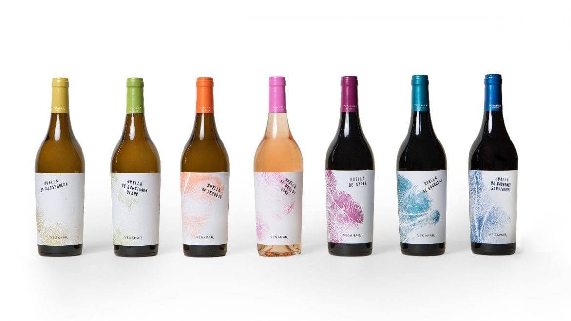 Las bote­llas de la colec­ción “hue­lla” de Vega­mar, con el nue­vo “hue­lla de Caber­net Sau­vig­non”.