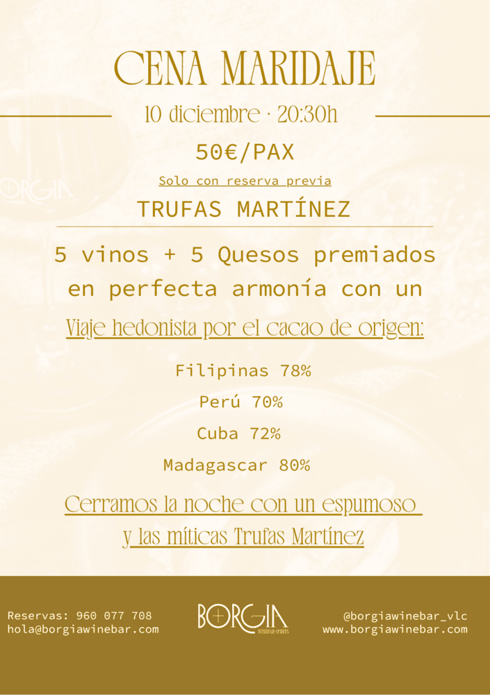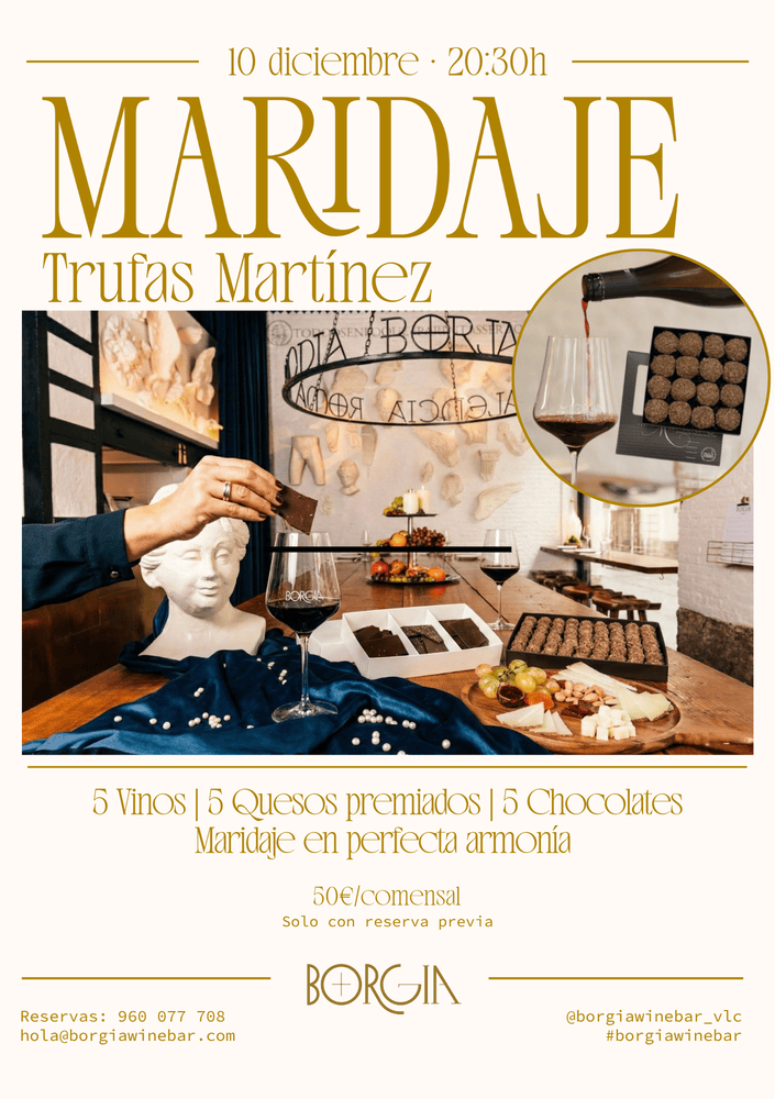 El próximo martes 10 de diciembre a las 20:30 h, BORGIA Winebar + Spirits y Trufas Martínez se unen para ofrecer una cena maridaje en València.