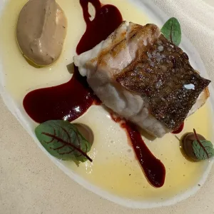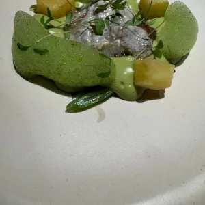 El menú comen­zó por una quis­qui­lla de San­ta Pola mari­na­da, para con­ti­nuar con una coco­cha de mer­lu­za, judías y pata­tas en sal­sa ver­de. El ter­cer pase con­sis­tió en chi­pi­rón a la bra­sa, gale­ras, papa­da y que­so de La Case­ta d’Es­pa­dá, pla­to al que siguió una gam­ba roja a la parri­lla con gui­san­te lágri­ma y saba­yon.