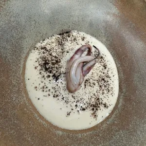 La expe­rien­cia con­clu­yó con un pos­tre igual­men­te sin­gu­lar, en el que se ela­bo­ró un flan de tru­fa negra y hela­do de leche de ove­ja ahu­ma­da.