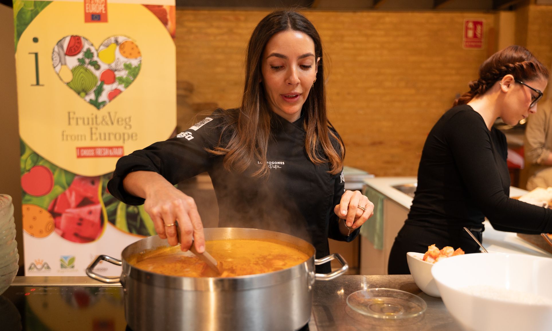 Uno de los momentos más destacados del evento ha sido el showcooking en directo protagonizado por la chef Patricia Fontes (@losfogonesdepatri), quien ha deleitado a los asistentes con recetas creativas, saludables y fáciles de incorporar al día a día. Durante su propuesta gastronómica, los invitados han degustado una cuidada selección de aperitivos como una gilda de autor elaborada con boquerón, pimiento y aceituna; una original tostada de hojaldre caramelizado con guacamole, anchoa, fresa y pétalos de rosa; o un cono crujiente de rosquilleta relleno de ensaladilla rusa a base de patata, zanahoria, encurtidos, atún y mayonesa, coronado con una piparra. La experiencia se completó con una exquisita tabla de quesos nacionales con variedades ahumadas, trufadas, parmesano y queso suave de oveja, decorada con fruta, verdura y frutos secos, además de un toque dulce con una carrot cake de nueces, zanahoria, dulce de leche y arándanos. Como plato principal, Fontes presentó un arroz meloso de sepia, calamar y gambón, acompañado de una mayonesa elaborada con la reducción del jugo de las cabezas de las gambas y boniato, poniendo en valor la frescura y versatilidad de las frutas y verduras europeas en una cocina moderna y equilibrada.