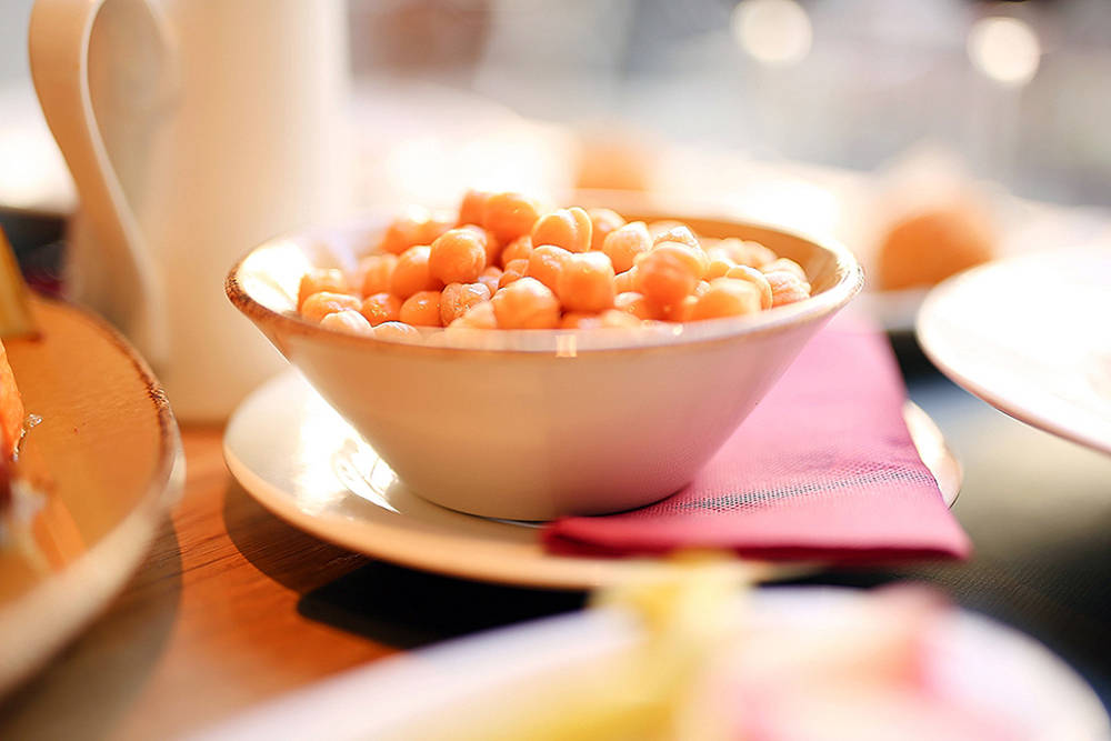 El fes­ti­val arran­ca con con una cro­que­ta de ropa vie­ja y una cre­ma de bonia­to rojo. Al lado salen los encur­ti­dos — guin­di­lla, pimien­to en sal­mue­ra y cebo­lla en vina­gre — y pan de masa madre del horno de San Bar­to­lo­mé. En el segun­do vuel­co sale el con­so­mé con un cane­lón de car­ne del coci­do, unas hebras de aza­frán y un bol de gar­ban­zos de León. El ter­cer vuel­co es el de la ban­de­ja ver­du­ras — pata­ta, napi­col, chi­ri­vía, bonia­to rojo, col y zanaho­ria — y las car­nes — garre­ta, mani­tas, pavo y galli­na, tocino, embu­ti­dos, jamón y pilo­ta con magro de cer­do, pollo y piño­nes — , ya cor­ta­das, des­hue­sa­das y lis­tas para comer. Para aca­bar, pos­tre case­ro.