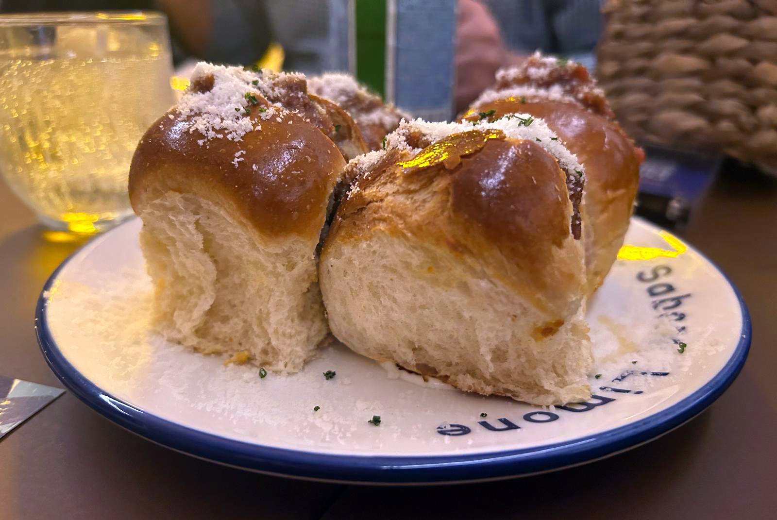 - Brioche de steak tartar con chile calabrese y queso parmesano reggiano.