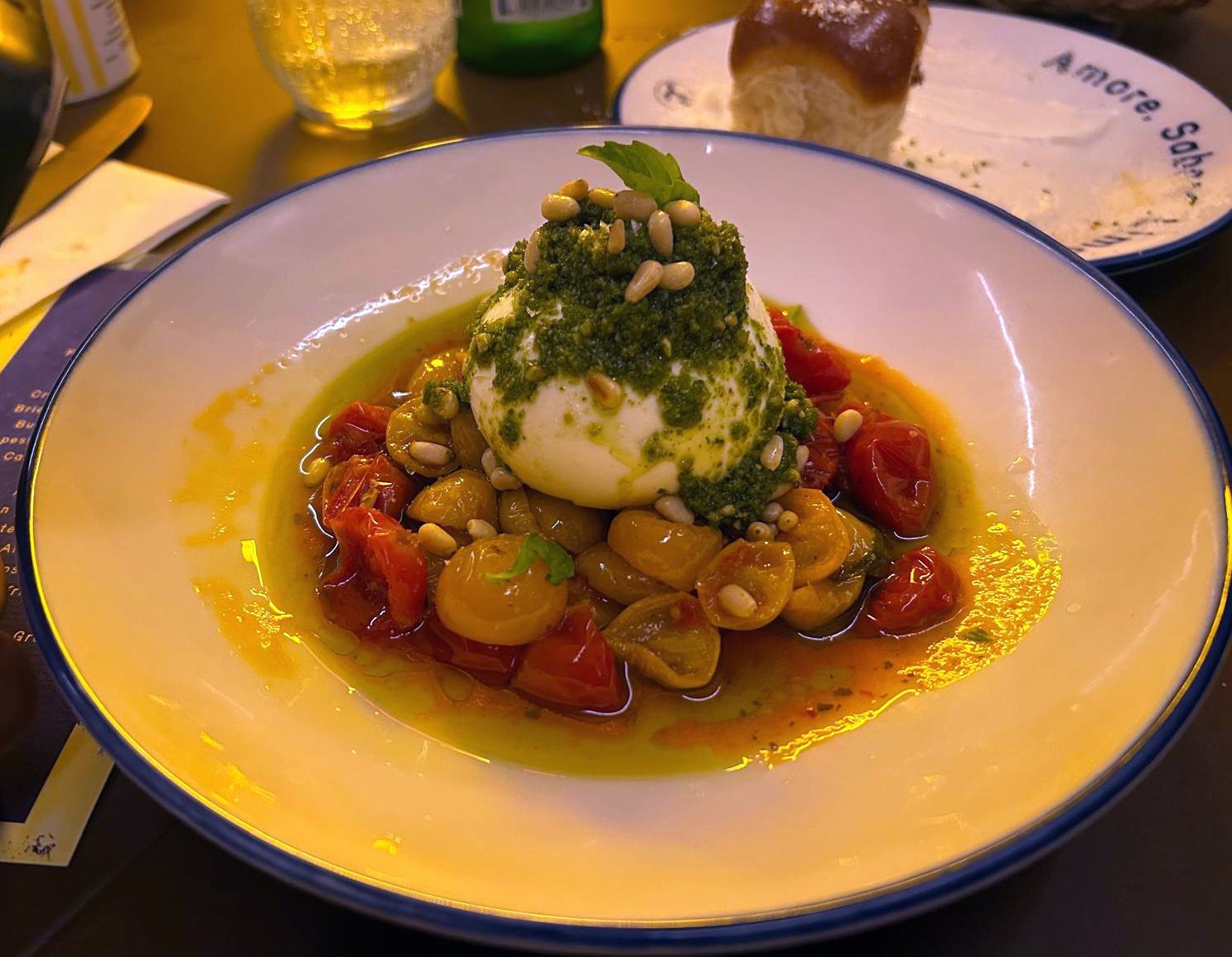 - Burrata con tomate confitado, tomate rojo y amarillo del Vesubio, salteados al limón con pesto genovese y piñones.