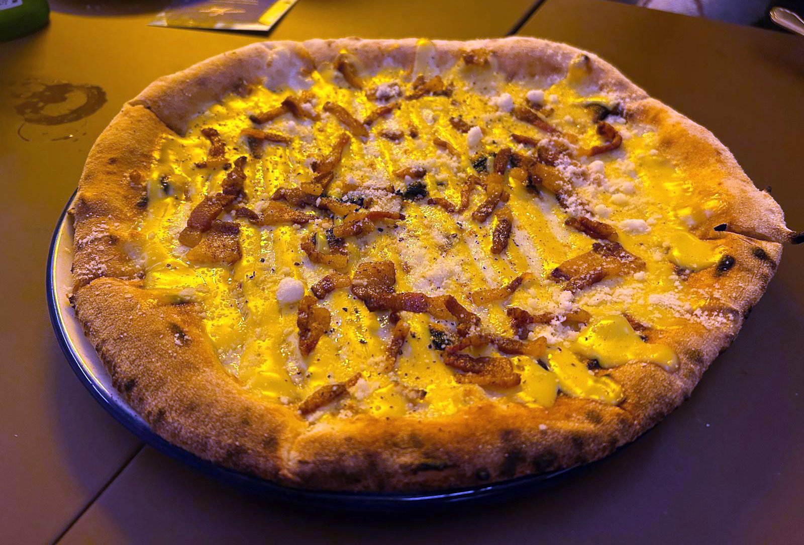 - Pizzas Carbomamma y Caprese (masas con un 68% de hidratación para conseguir una diferenciación de textura entre borde exterior e interior). Carbomamma emplea guanciale, pimienta y quesos pecorino romano y fior de latte. La pizza Caprese incluye tomate confitade, mozzarella di buffala y pesto genovese.