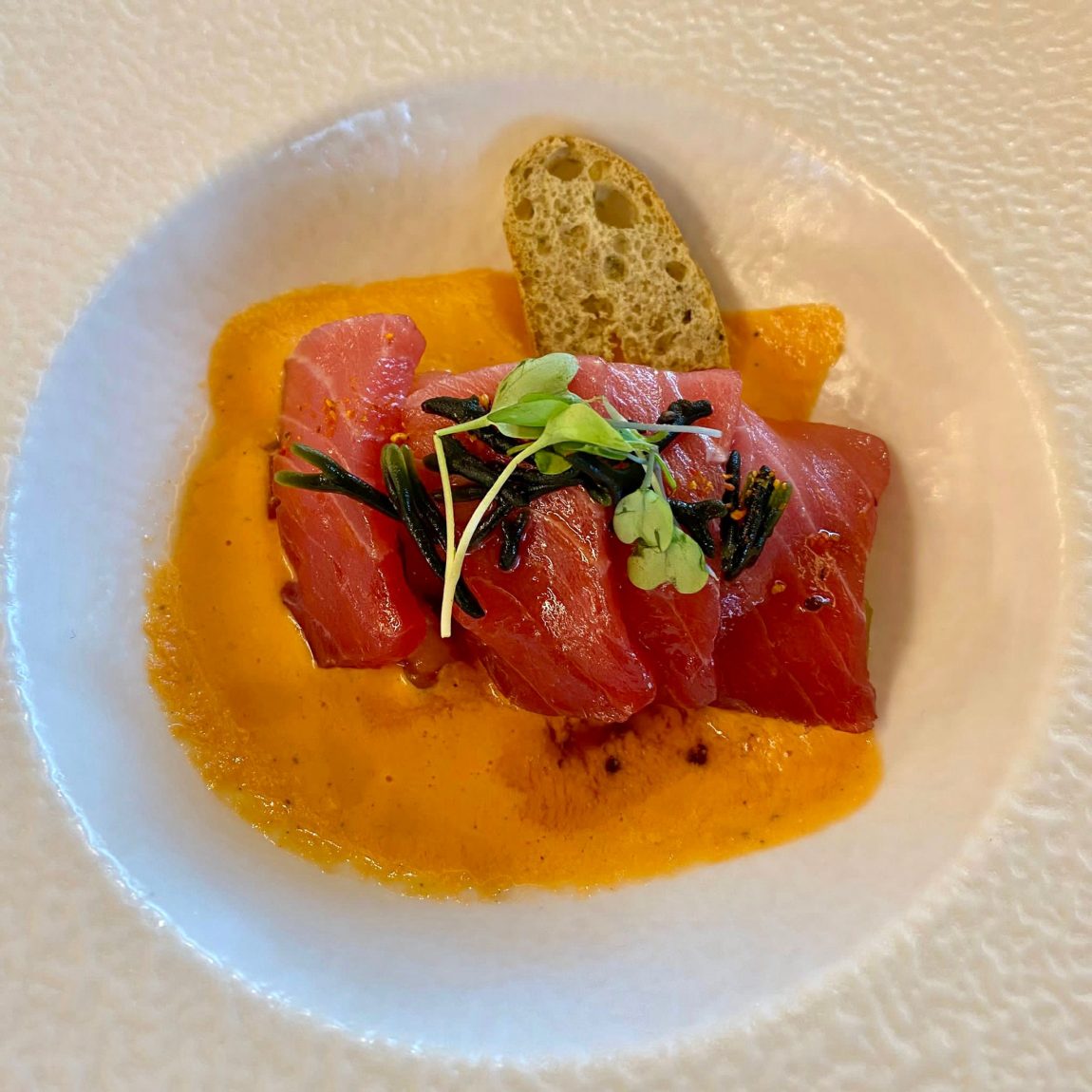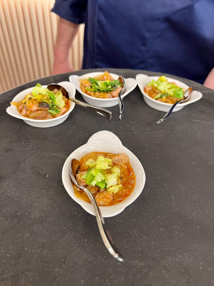 El res­tau­ran­te Nou Racó, con su jefe de coci­na Jor­ge Par­do a la cabe­za, fue el res­pon­sa­ble de poner la magia y con­ver­tir la car­ne roja del atún en un man­jar deli­cio­so que se pudo degus­tar en dis­tin­tas rece­tas como ence­bo­lla­do de atún, el clá­si­co tar­tar de la casa, atún cura­do en sal mari­na sobre toma­te en tex­tu­ras al toque de codium, ravio­li de ven­tres­ca de atún a la bra­sa con velo ibé­ri­co y emul­sión de Mery, arroz melo­so de atún con aje­tes, alca­cho­fas y sal­mo­rre­ta, y de pos­tre, cre­ma de naran­ja san­gui­na, gomi­no­las de atún rojo mari­na­do en mis­te­la y miel con hela­do de cho­co­la­te negro con sal mal­don.