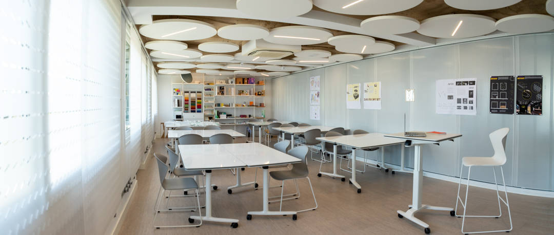La nueva Aula Smart ha supuesto un proyecto de renovación y transformación integral del espacio que incluye innovaciones en suelo, techo e iluminación, la incorporación de mobiliario móvil y abatible, una pantalla táctil que controla todas las funciones domóticas y una materioteca con un amplio catálogo a disposición de los alumnos. El espacio resultante es ágil y versátil, capaz de acoger clases teóricas y, también, sesiones de trabajo en equipo.