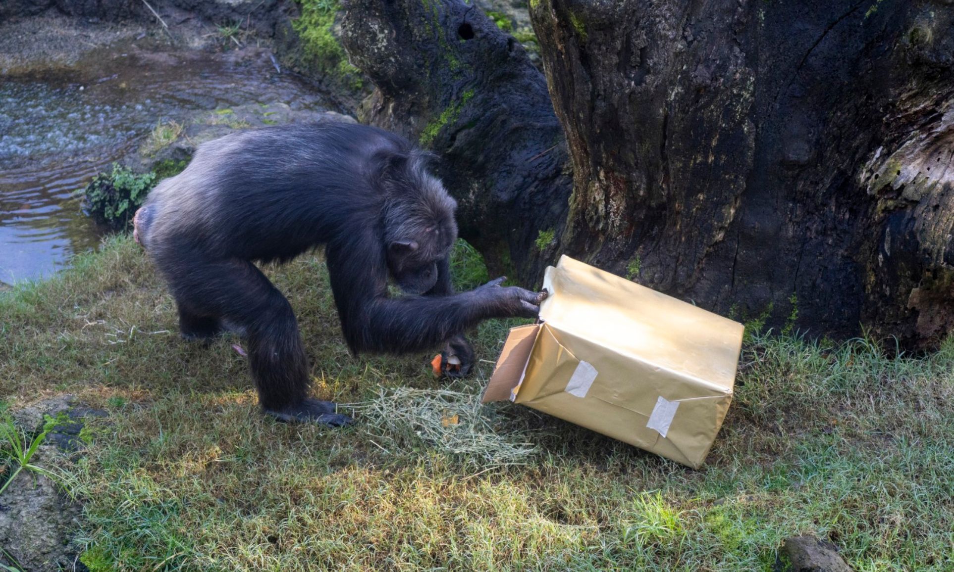 Para los leones, llevarse la mejor parte de la sangrienta carne era el objetivo, tanto de Lubango como de las dos hembras, Shanga y Tata. Algunas carreras y sonoros rugidos mostraban el papel que ejerce cada animal y finalmente todos han tenido su preciado premio. Muy distinta ha sido la reacción de las mangostas rayadas, donde la colectividad prevalece. Algunas hortalizas y pequeños camarones esparcidos e insertados en elementos móviles despertaban su ingenio para alcanzarlos. La manada de elefantas hace evidente su naturaleza protectora y para las crías lo más llamativo son los juguetes en forma de ramas de todo tipo y tamaños y las cajas, que van rompiendo y desplazando con sus patas y trompas, todavía con cierta impericia en el manejo de su fuerza, lo que resulta enternecedor. En el caso de los chimpancés, con todo el grupo al completo y destapando los paquetes en búsqueda de manjares, puede observarse las jerarquías y rol de cada uno. Destaca el importante nexo entre las madres con sus crías y cómo demandan su abrigo, la incitación al juego, así como el contacto y la comunicación como base fundamental de unión de toda la “familia”.