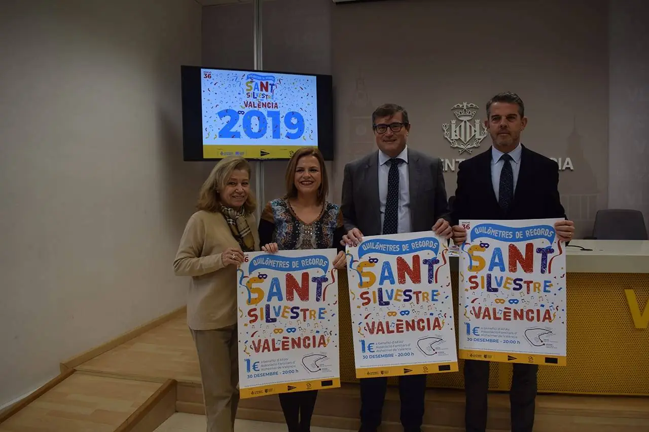 La concejala de Deportes, Pilar Bernabé, acompañada del director regional de Comunicación y Relaciones Institucionales de El Corte Inglés, Pau Pérez Rico, de la presidenta de AFAV (Asociación de Familiares de Alzheimer València), Ana María Ruiz, y Vicente Sanz, en representación de la SD Correcaminos, ha presentado hoy la 36ª edición de la San Silvestre Popular Valenciana. Una jornada lúdica deportiva que se celebrará el próximo lunes 30 de diciembre, a partir de las 20:00 horas, y en la que 17.400 corredores y corredoras despedirán el 2019 al completar un recorrido de 5,3 Km disfrazados y disfrazadas. La carrera tiene dos modalidades, una competitiva y otra que no, pero idéntico componente solidario, ya que el importe íntegro de las inscripciones se destinará a la AFAV.