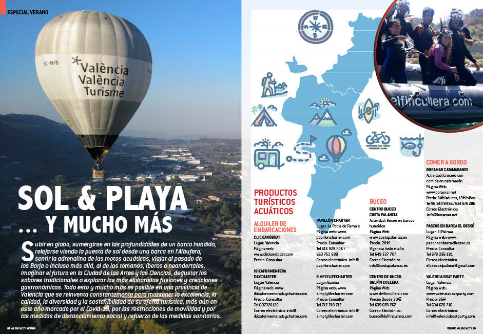 Así, por ejem­plo, la revis­ta publi­ca un amplio repor­ta­je infor­ma­ti­vo bajo el títu­lo “Sol & Pla­ya… y mucho más”, don­de se infor­ma deta­lla­da­men­te sobre cer­ca de un cen­te­nar de pro­duc­tos turís­ti­cos alter­na­ti­vos, des­de paseos en bar­co o cir­cui­tos hípi­cos, a visi­tas a bode­gas, cer­ve­ce­ras o expe­di­cio­nes de mon­ta­ña y sen­de­ris­mo. Una com­ple­ta guía para lle­var a cabo un verano dife­ren­te que, en muchos aspec­tos, recu­pe­ra sen­sa­cio­nes de otras épo­cas, cuan­do se via­ja­ba menos y nos reen­con­trá­ba­mos con lo más cer­cano, las pobla­cio­nes y la natu­ra­le­za que tenía­mos a dos pasos de casa.