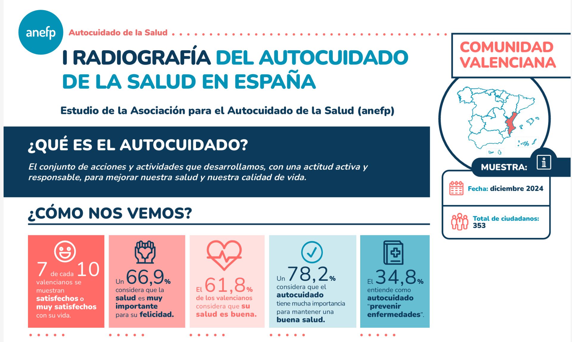 Con motivo del Día de la Comunidad Valenciana, la Asociación para el Autocuidado de la Salud (anefp) ha presentado los resultados de la I Radiografía del Autocuidado de la Salud en España, un estudio que analiza los hábitos y percepciones de los ciudadanos en materia de bienestar físico, mental y social.