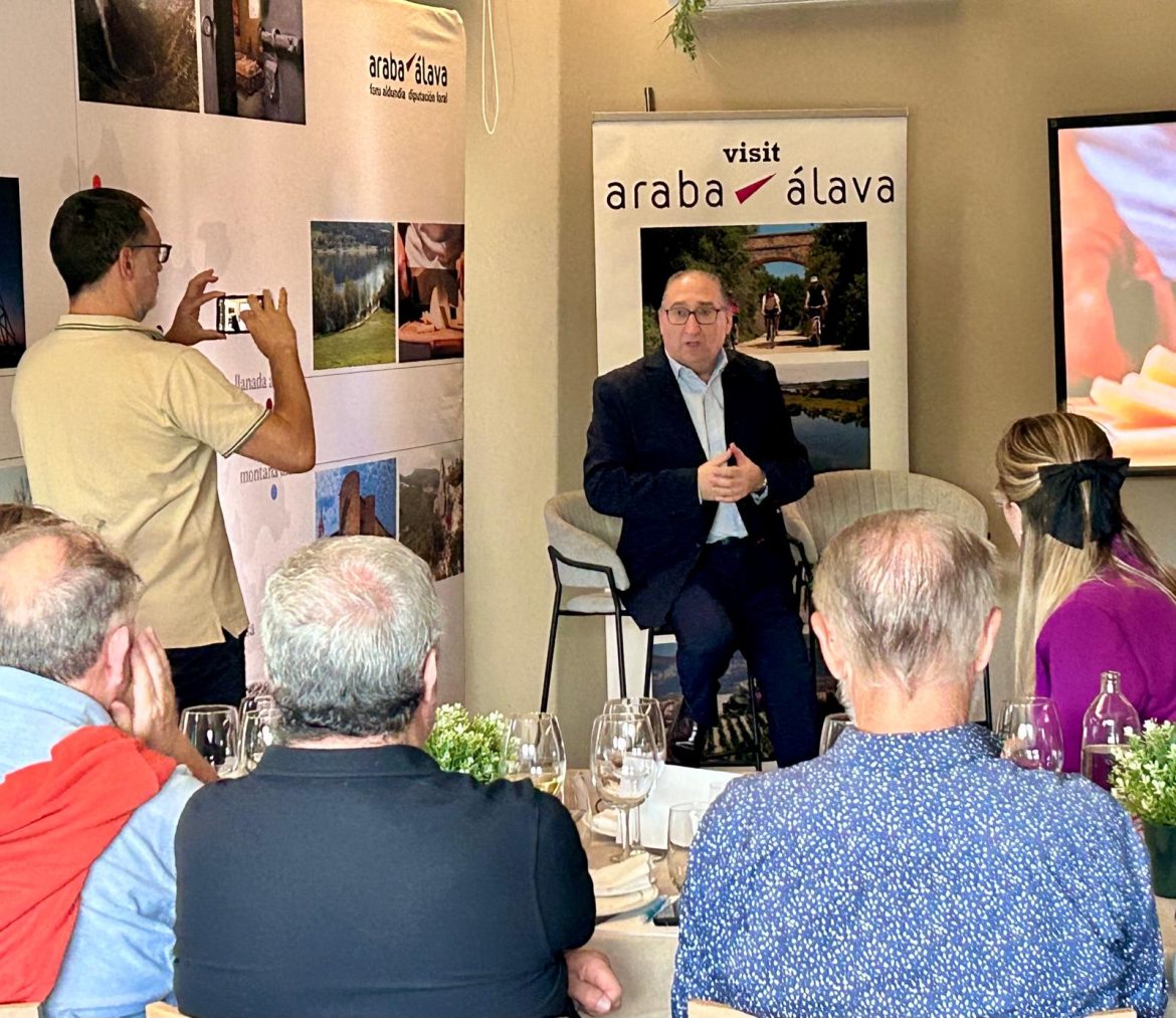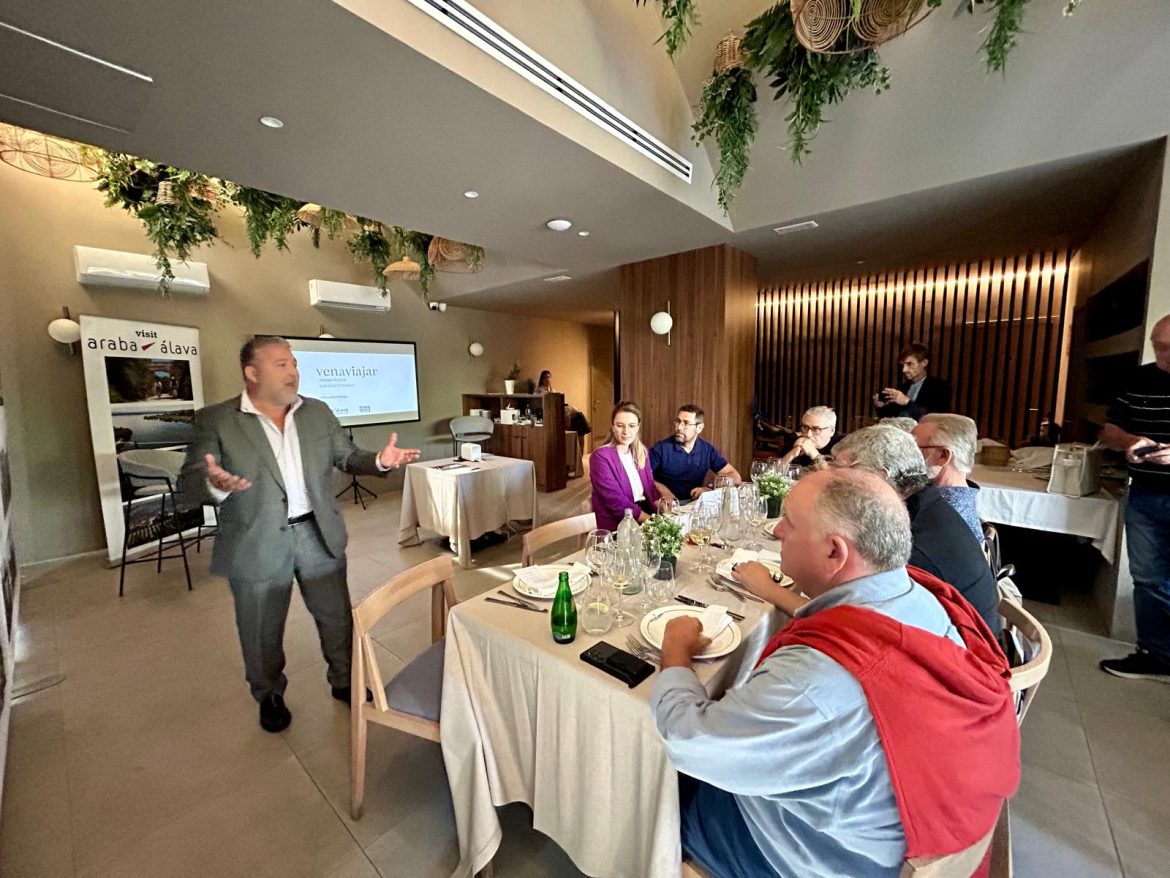 La comida estuvo precedida de una presentación de los principales atractivos turísticos de Álava, a cargo del periodista Fernando Balmaseda. En la exposición, Balmaseda incidió en los principales valores del territorio: patrimonio natural e histórico, enología, gastronomía y rutas verdes, entre otros atractivos. Balmaseda ofreció datos sobre el trabajo en materia de Turismo desarrollado por diferentes entidades y animó a descubrir las áreas rurales situadas a apenas unos minutos de la capital Vitoria, que carece de “problemas de masificación y turismofobia”. Balmaseda adelantó algunos de los planes de Turismo de Álava, como la recuperación de la ruta del txacolí o la “paquetización” de la oferta turística, que se presentará en la próxima edición de Fitur y a la que podrán acceder agentes y operadores a través de una plataforma creada ad hoc.